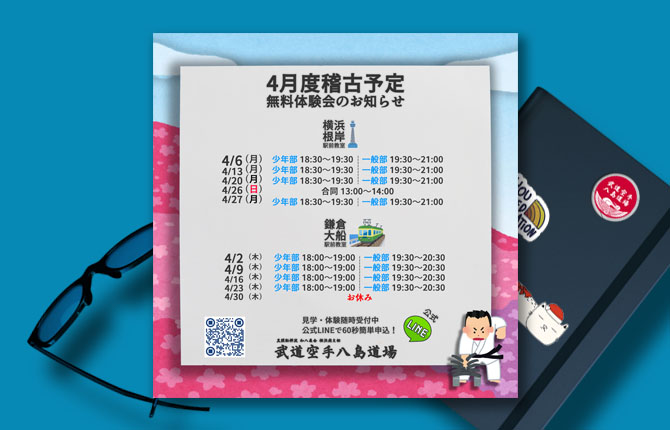 武道空手八島道場では、毎週月曜日(根岸)と木曜日(大船)に無料体験会を開催しております。